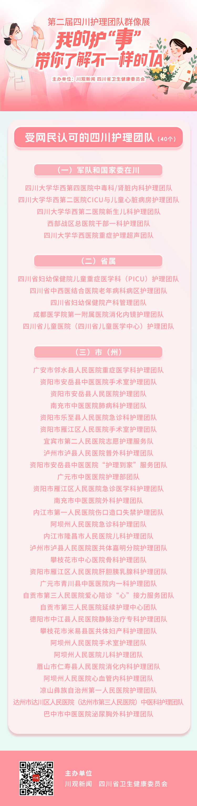 活动开展以来,数百家医疗机构热情响应,一封封饱含团队故事与专业精神的自荐信纷至沓来。经过激烈角逐,200余支护理队伍脱颖而出,登上展播舞台。最终,40支兼具专业实力与人文温度的“明星团队”,凭借精湛的护理技艺、暖心的服务故事,成为网民心中的“护理天团”。它们中,有深耕临床多年、技术精湛的“老牌劲旅”,也有充满创新活力、勇于开拓的“新生力量”,共同代表了四川护理行业的高水平。