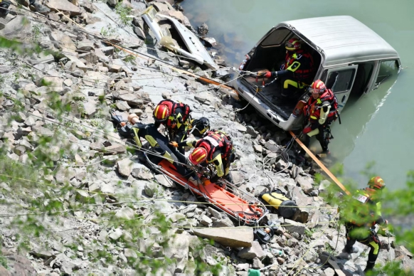消防员对坠江车辆进行固定,防止车辆进一步下坠。