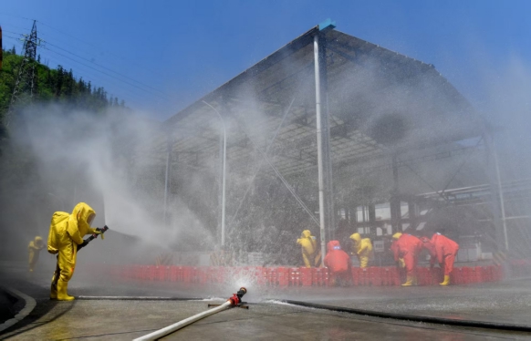 演练中,消防员用水炮稀释“泄漏”的浓盐酸。