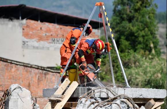 在回隆镇叶坪村的一片废墟前,雅安市消防救援支队的消防员们迅速投入到了人员搜救中,在搜救犬和生命探测仪的帮助下,他们确定了三处“人员”被困区域。消防员清理废墟,在楼板间搭建起支撑结构,并用液压工具切割破拆,不时为“被困者”加油打气。