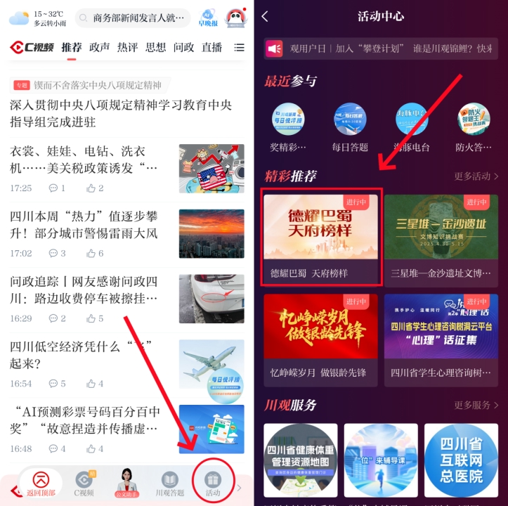 方式二:在川观新闻首页,点击右下角“活动”,进入到“活动中心”,找到“德耀巴蜀 天府榜样”活动图片即可进入提交线索入口。