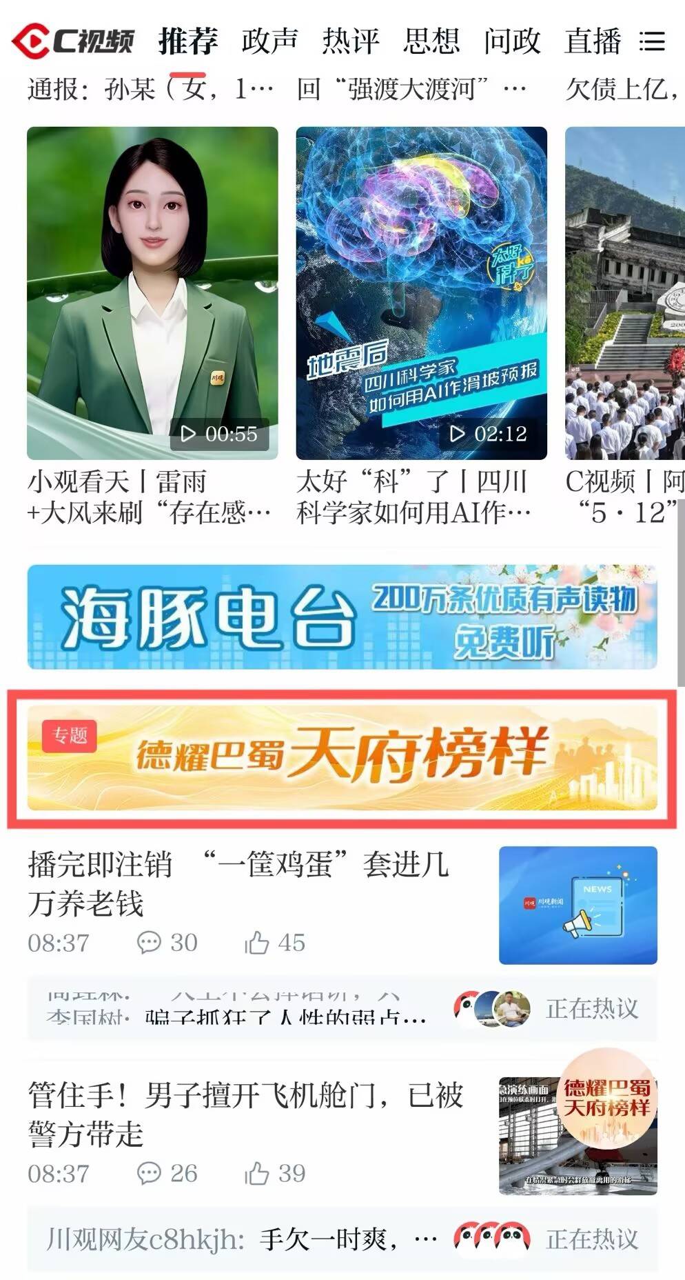 5月13日,“德耀巴蜀 天府榜样”征集传播平台在川观新闻客户端首页正式上线。平台由中共四川省委宣传部、四川省精神文明建设办公室主办,四川日报全媒体承办,将常态化报道群众身边的感人故事,同步开放“天府榜样”新闻线索征集渠道。无论你是随手抓拍的感动,还是亲身经历的温暖,都可能成为全川热转的“正能量爆款”。