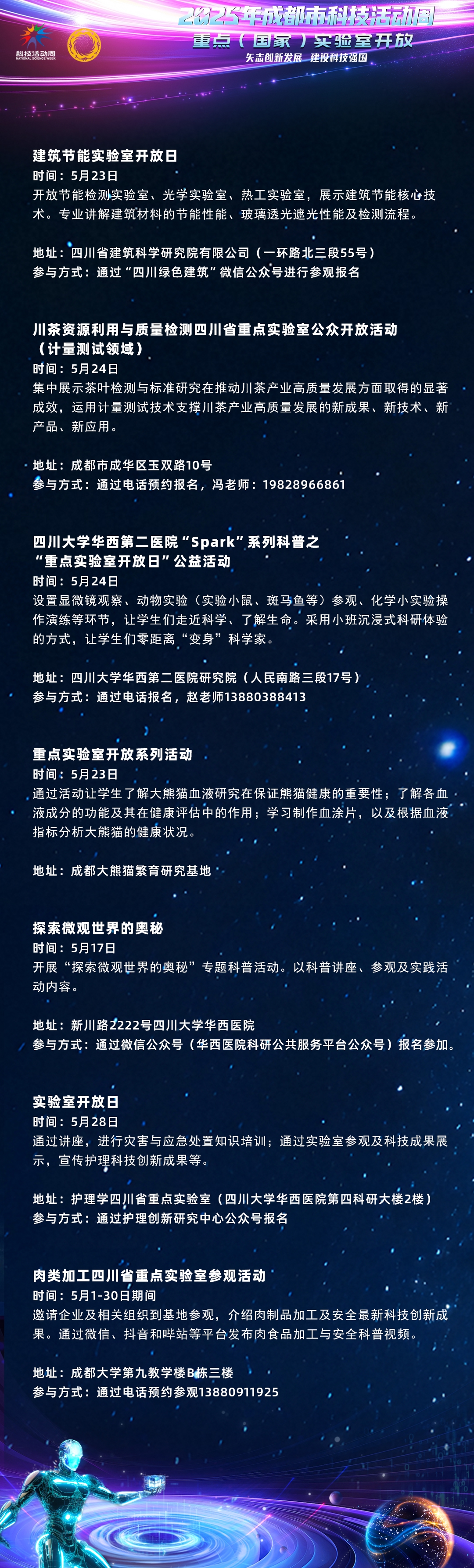 2025年四川省科技活动周暨蓉城科学之夜启动仪式将于5月23日晚举行,通过线上线下结合形式,展现科技工作者的探索精神,展示歼-10C、华龙一号、氮化镓量子光源芯片等2024年四川省及成都市重大科技成果,营造科普惠民的浓厚氛围。