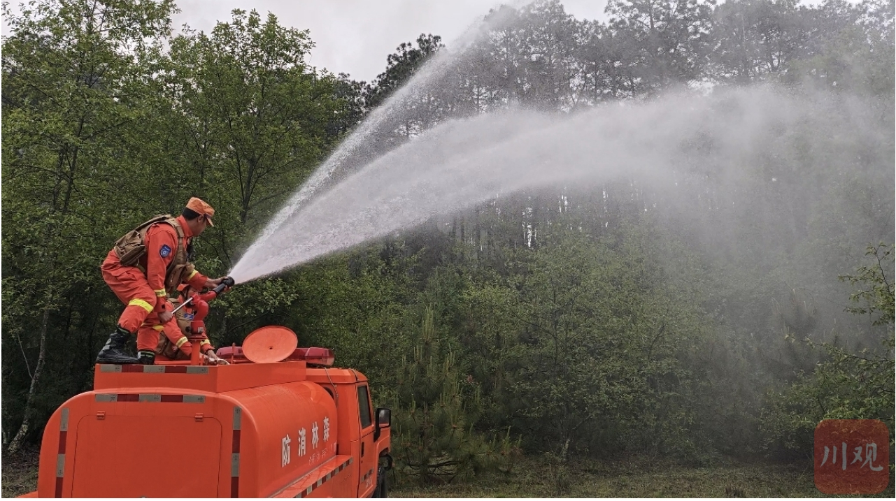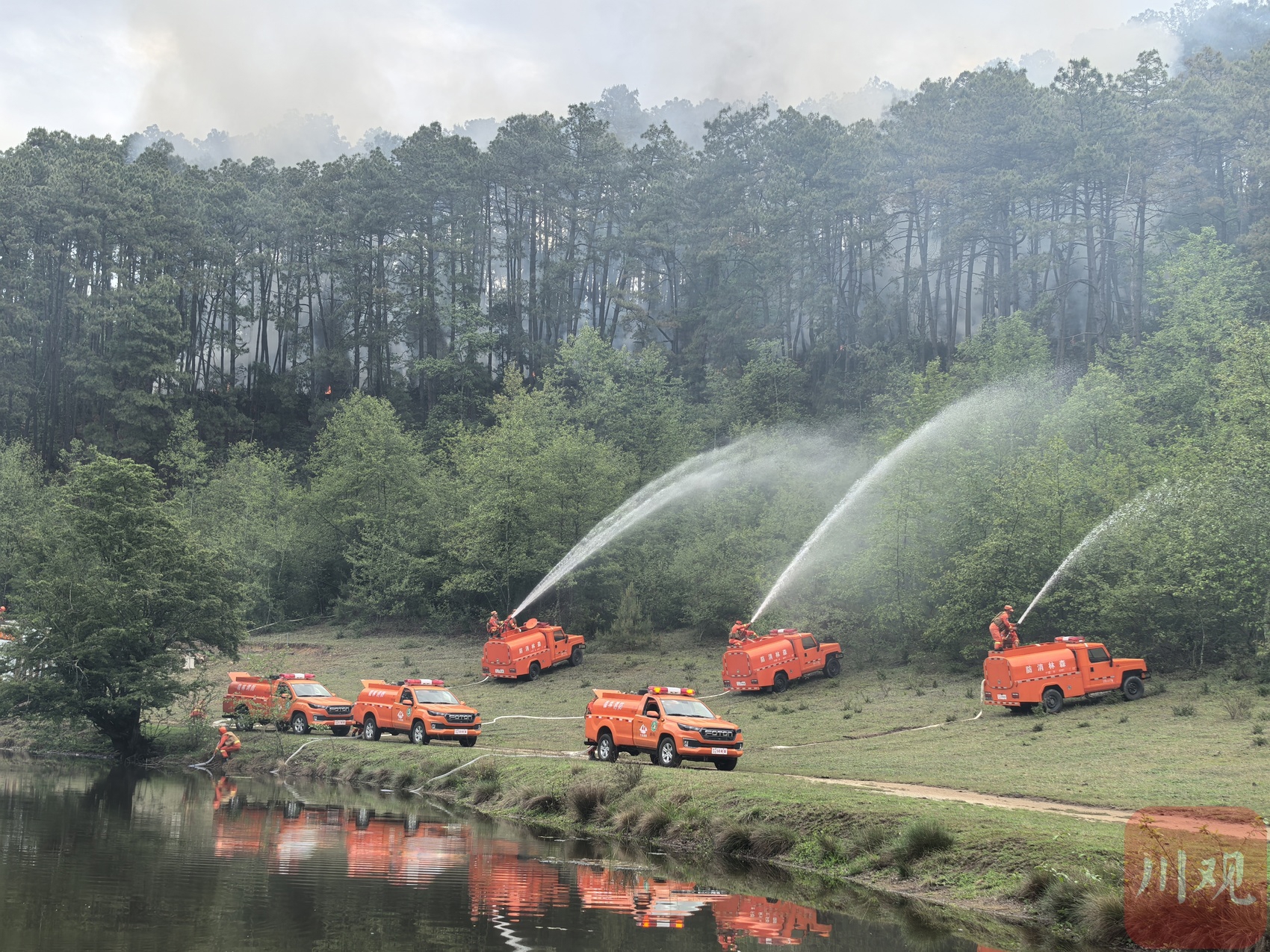 演练现场,高扬程水泵轰鸣作响,多辆水罐车的水炮集中出水,在林区边缘形成一道阻碍火势蔓延的幕墙;冕宁县综合应急救援大队的队员们在池塘边取水,通过水带接力架起上百米的水龙,在林区深处直击火头;彝海镇应急队的队员们紧跟“水龙”,用铁锹、背负式水枪清理烟点……不到1小时,“火场”已处置完毕。