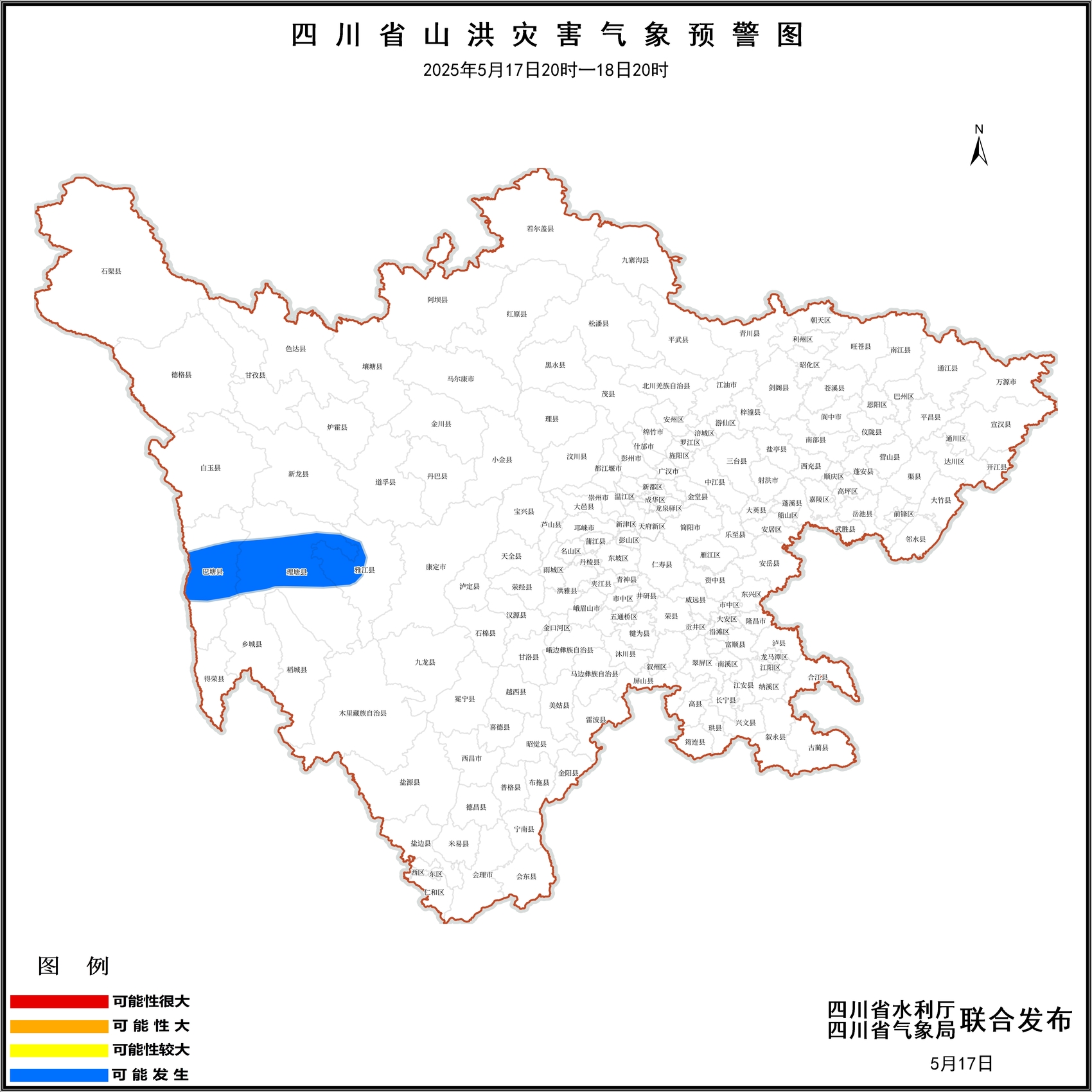5月17日17时,四川省水利厅、四川省气象局发布山洪灾害蓝色预警。