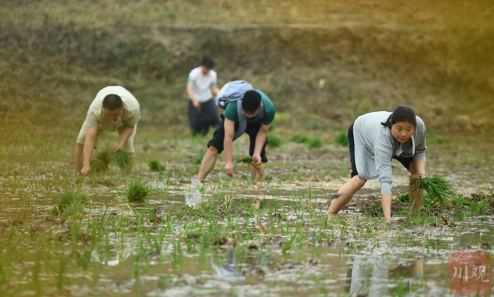 2025年5月17日,在四川省成都市双流区永安镇梨园村,成都开放大学双流学院的大学生正在帮农户插秧。