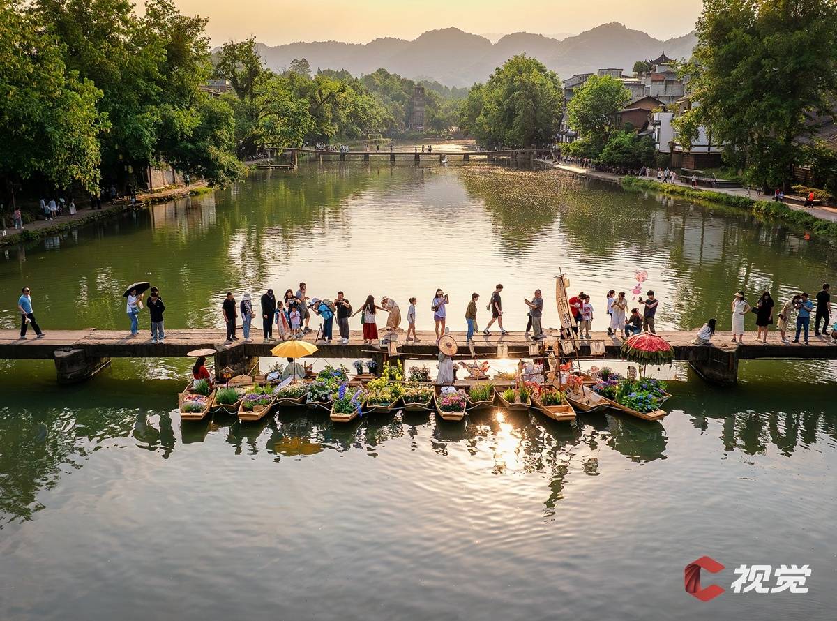 5月4日,成都邛崃市夹关古镇的水上市集,游人在古镇、古桥穿行,感受水乡别样的韵味。