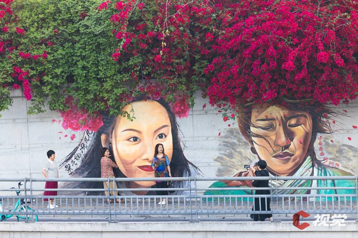 5月2日,绵阳市涪城区三里桥彩绘墙三角梅盛开,盛开的鲜花与墙绘完美融合,吸引许多市民游客前来打卡。