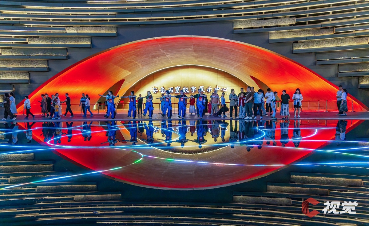 5月1日晚,资阳市安岳石窟数字展示中心正大门,通过水中倒影形成的“网红眼”造型,格外吸引游客。
