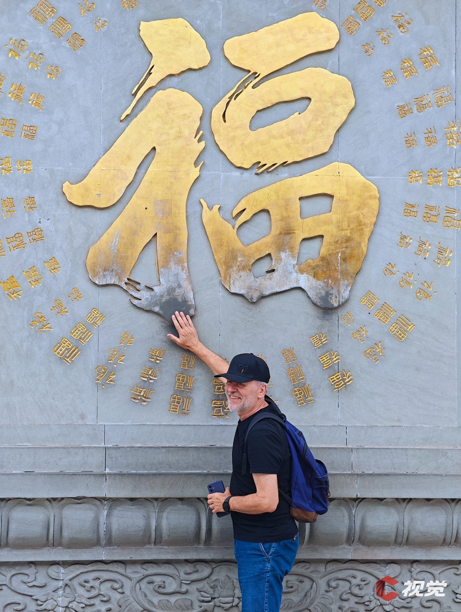 4月29日,一名外国游客在成都市千年古刹大慈寺门外入乡随俗摸“福”字。