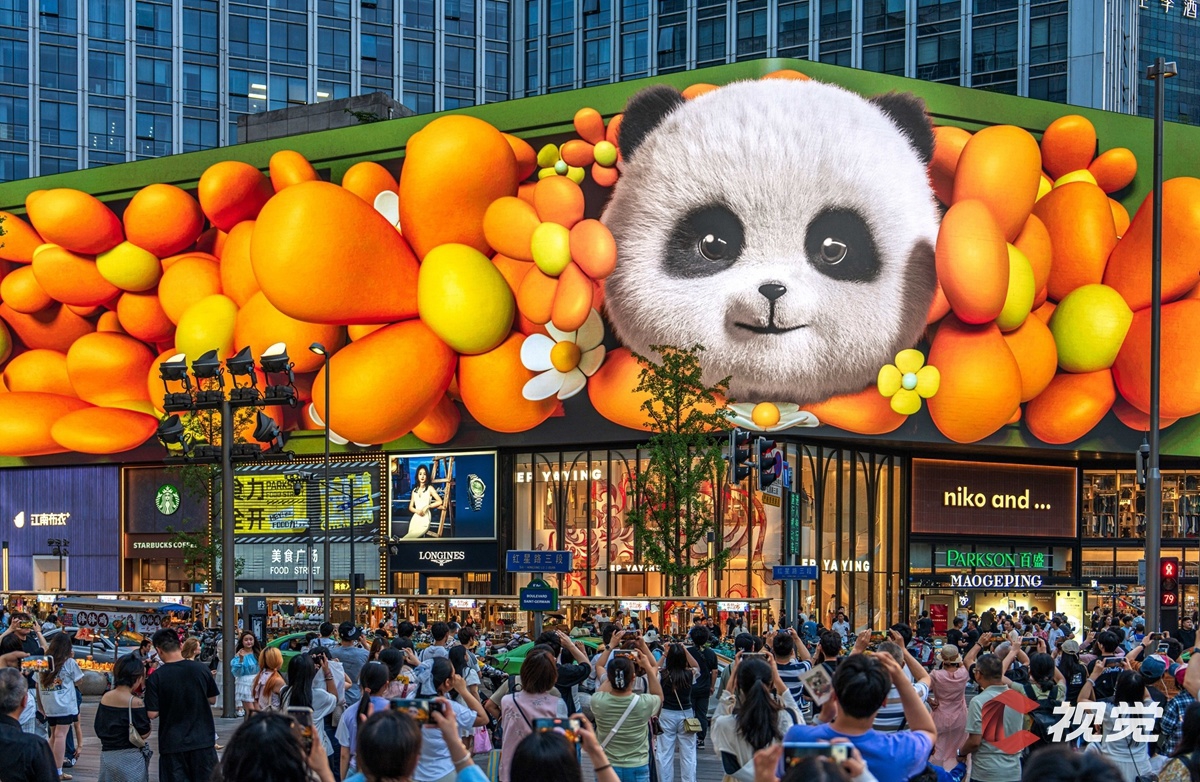 5月4日,成都市中心春熙路商圈、太古里商圈迎来大量游客。众多游客在春熙路商圈的裸眼3D大屏前拍摄打卡。