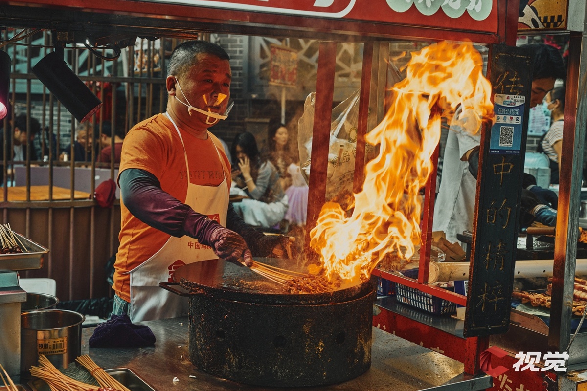 5月1日晚,成都市抚琴夜市热闹非凡,游客在浓浓的烟火气中感受成都人悠闲的市井生活。