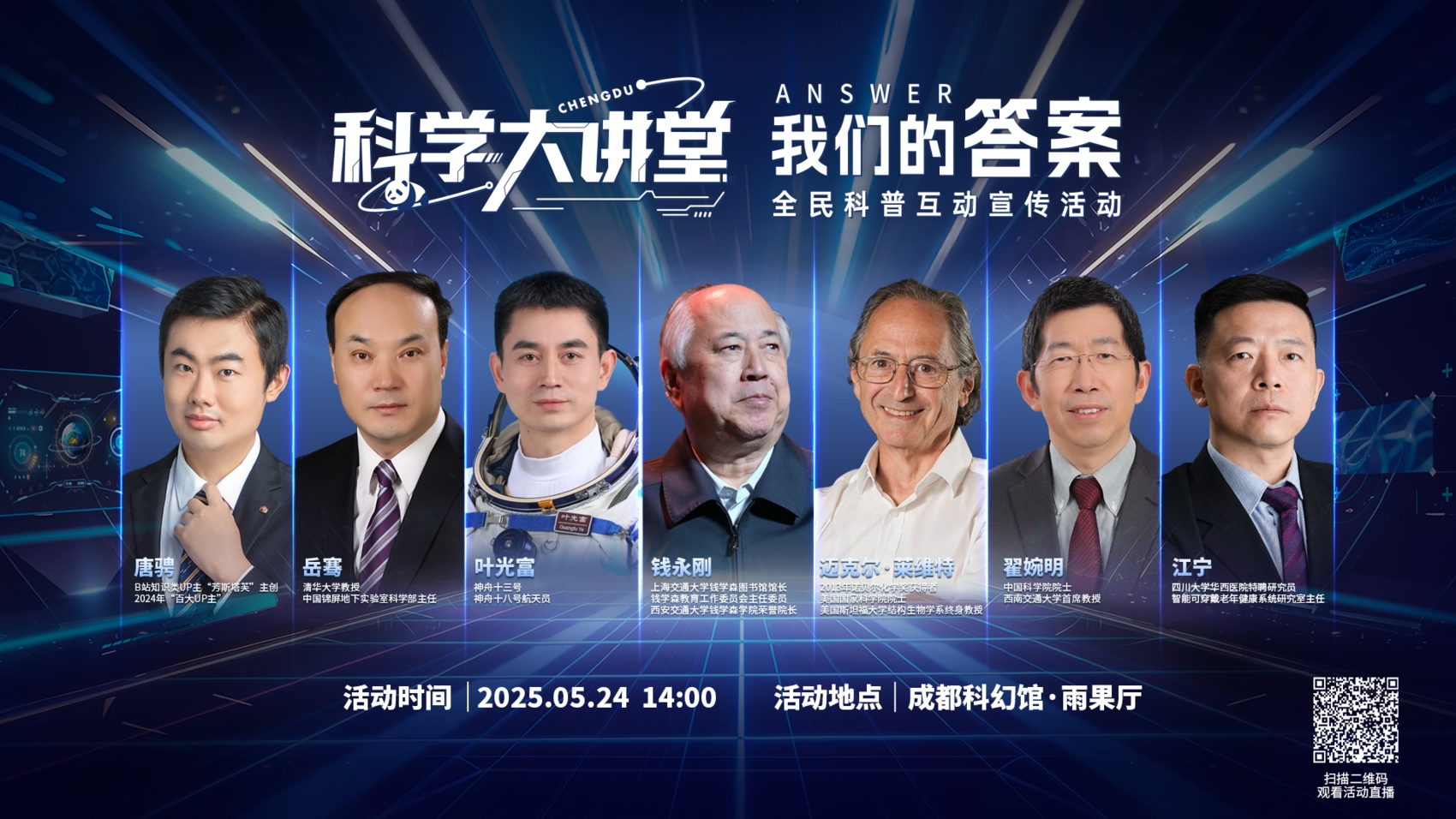 “科学大讲堂·我们的答案”全民科普互动宣传活动是以服务国家“科技强国”战略为导向,深度融入成都“科幻之都”文化基因与“创新之城”产业优势,以“科学殿堂的大众之窗”和“中国科学的成都讲台”为核心理念打造的集科学传播、兴趣激发、素养提升、精神弘扬于一体的综合性科普平台。