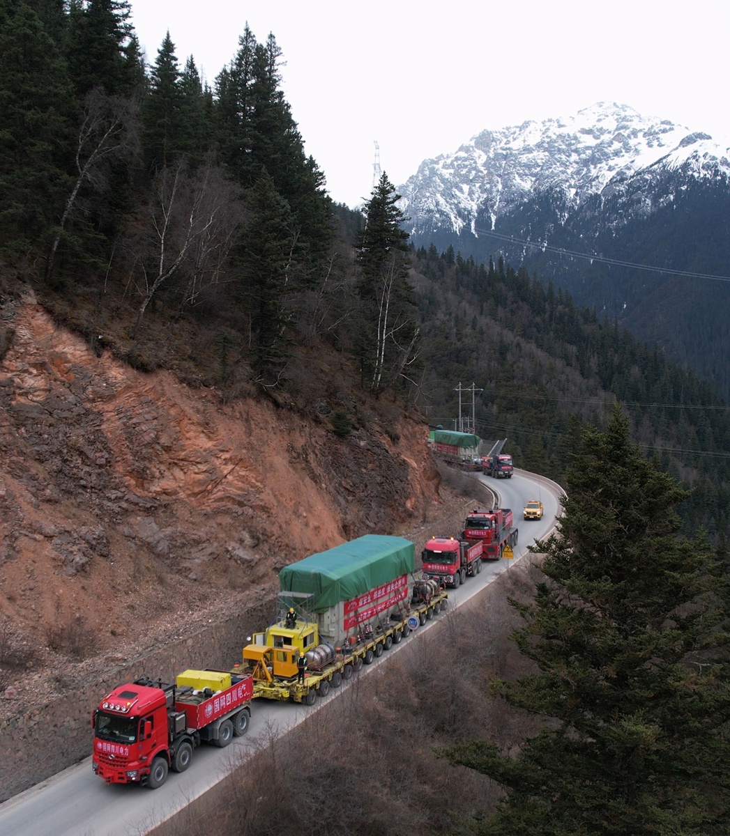 “这次运输最难的就是翻越4000米的中咱山,我们反复对路线进行踏勘。”业主项目部执行经理任泽说,他们组织运输单位投入22台牵引车、6套三纵列平板车、80余名施工作业人员分三班次滚动式运输,同时积极与沿线途经所有县市公路部门沟通协商,确保完成运输任务。