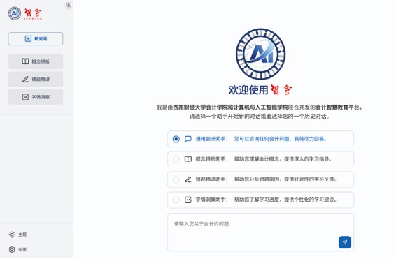 “智会”平台由西南财经大学会计学院、计算机与人工智能学院联合研发。依托AccMind模型基座,“智会”构建覆盖“教—学—练—评”全链条的一体化架构,创新集成学理辩证、错题精讲、学情洞察三类智能教学助手,可为教师提供7×24小时“智能助教”服务,为学生生成个性化学习方案,实现课堂教学、实践训练与学习评价的闭环管理。