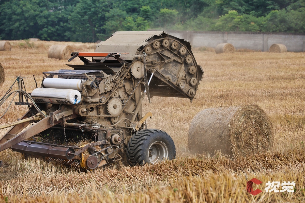 工作人员驾驶操作机械,将麦秆卷成“瑞士卷”。