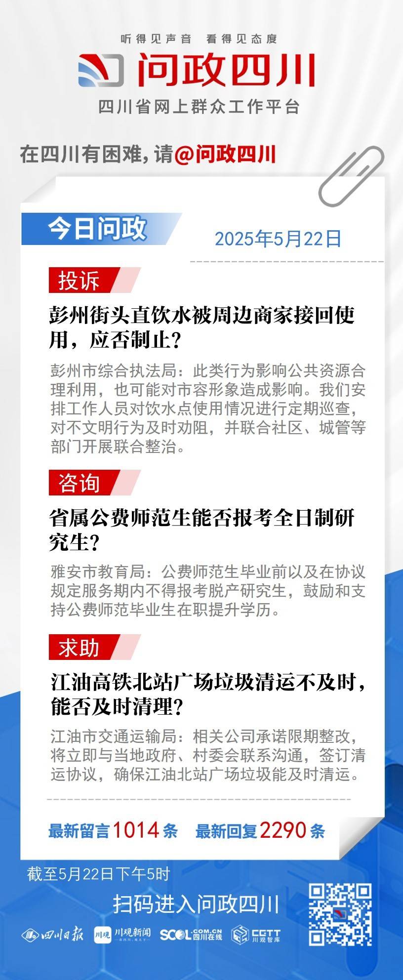 问政四川网友提问:彭州街头的免费饮水点解决了群众饮水难题,传递城市关怀。近期,我发现饮水点周边有茶馆在直接取用,这种不文明现象应否劝导、制止?