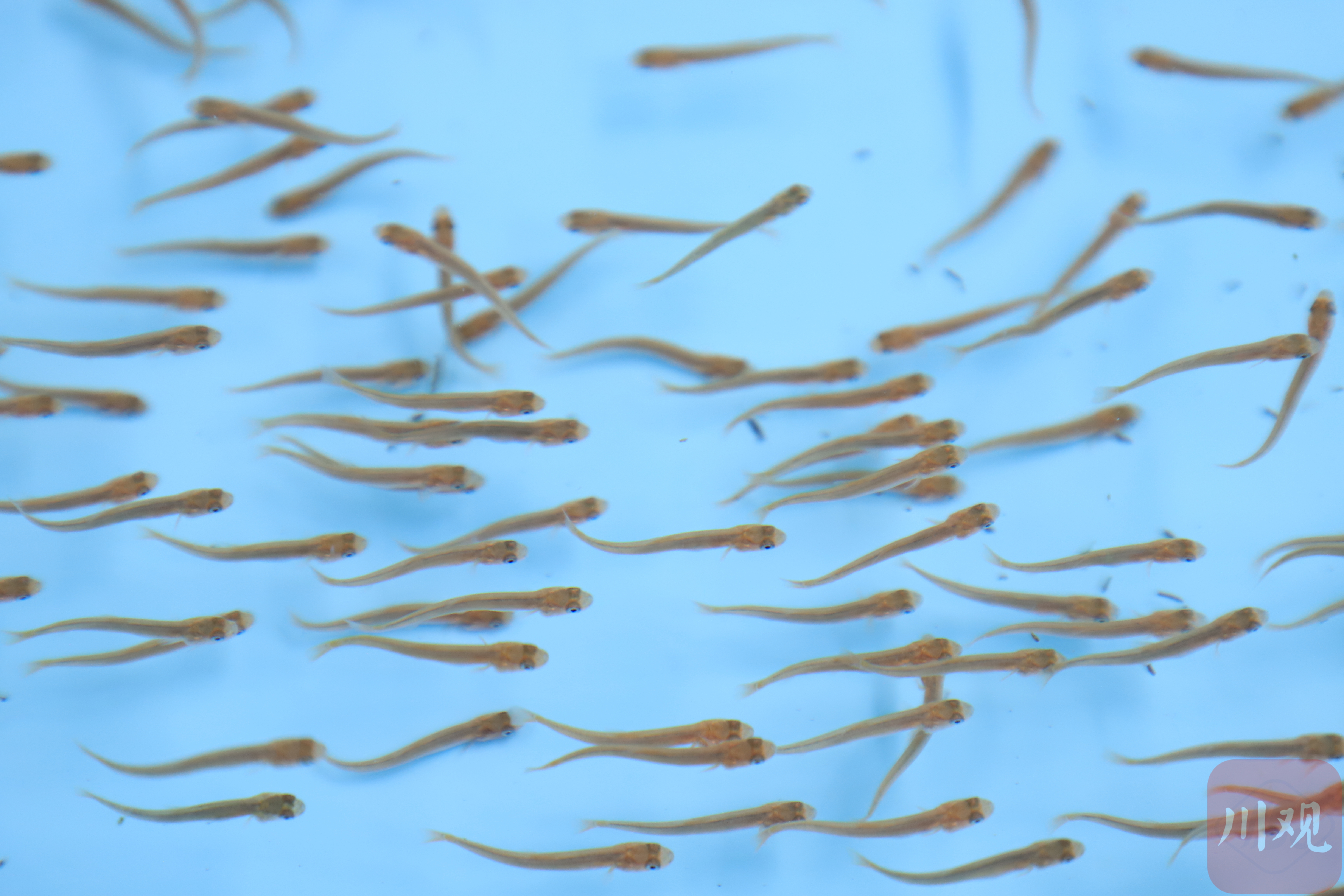 在海拔2900多米的四川省阿坝藏族羌族自治州马尔康市日部乡,当下气温还只有10多摄氏度。记者走进脚木足河畔鱼类增殖放流站综合培育车间,看见6个繁育水槽内,密密麻麻分布着2.5至3.5厘米长的小鱼苗。一走近,小鱼就从水槽一侧快速游往另一侧,活力十足。