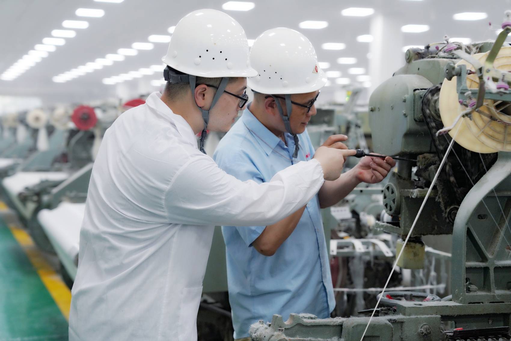 肖丁天(右)与同事在进行纺织机械设备的检修与维护。达州市委组织部供图