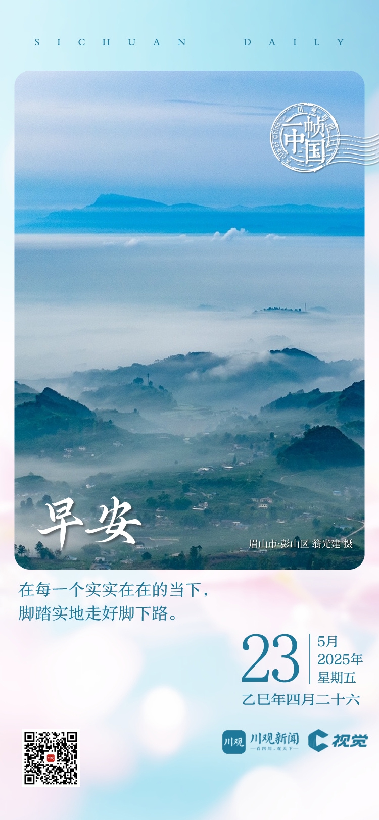 今天的《一帧中国》,川观新闻带你来到眉山市彭山区境内的彭祖山,只见朝霞、云雾与远山交相辉映,这是大自然的妙手创作的流动丹青画卷。