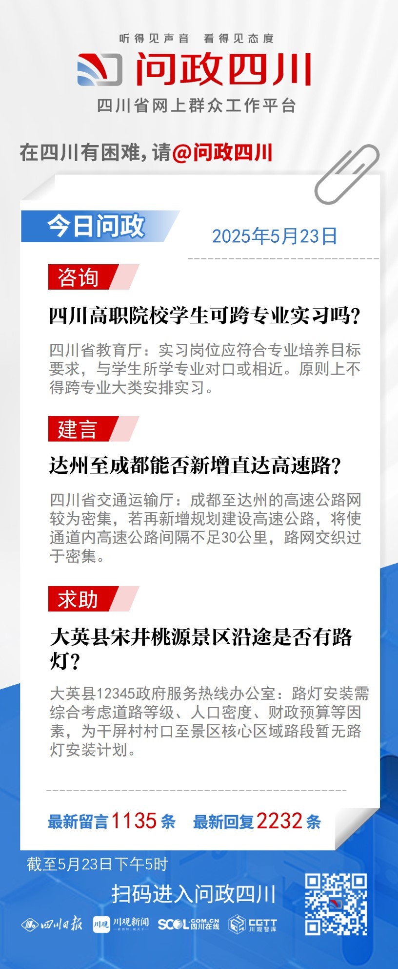 在四川有困难,找问政四川。如果您在四川遇到了操心事、烦心事、揪心事,请登录“四川省网上群众工作平台—问政四川”或拨打问政四川热线(028-96001)留言反映、求助或建议。我们将充分发挥平台的互动联系作用及舆论监督功能,第一时间传递民声,推动问题得以及时解决——听得见声音,看得见态度。