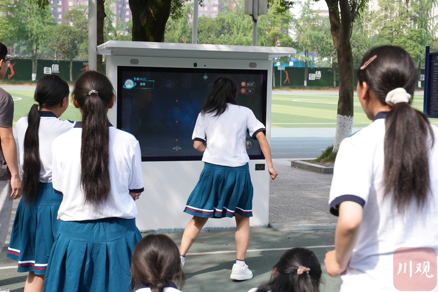 白玉县中学“武侯班”的同学在武侯区实验中学体验体育课。通过智能大屏,同学们可以通过快速抬腿左右移动来操控飞机,从而锻炼核心力量。