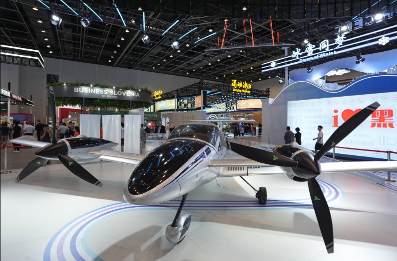 在“数智中东欧”展区拍摄的浙江万丰集团旗下奥利地钻石飞机公司研发的一款混合动力飞机。