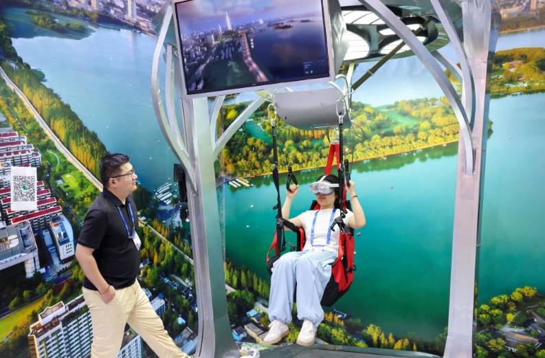 5月23日,观众在文博会上体验VR滑翔伞游南京。