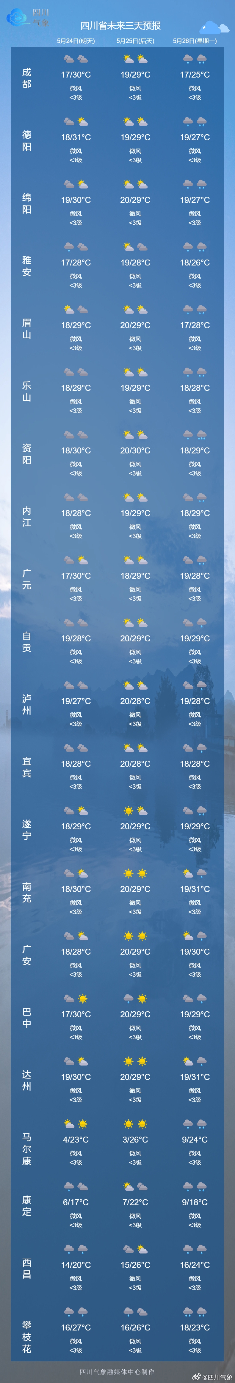 四川省气象台预计,今天晚上到26日白天,盆地以多云天气为主,分散阵雨或雷雨主要出现在盆周地区。