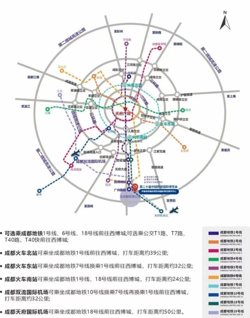 西博会举行的地点在中国西部国际博览城(天府新区福州路东段88号),群众可乘坐地铁路线1/6/18号线在西博城C/D口出站,或者乘坐1号线在广州路F口出站。公交方面,可乘坐T1/T21路在广州路站下车。