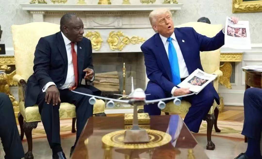 5月21日,美国总统特朗普在白宫会见到访的南非总统拉马福萨时,突然展示一些视频和剪报,指责南非正出现“针对白人的种族屠杀”。对此,拉马福萨当场否认。