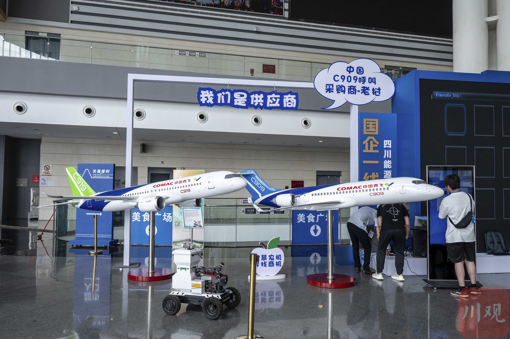 记者特别注意到,在本次西博会创新设置的“采购商集结站”,放置着一架C909飞机模型,一旁的电子大屏则滚动着西博会展馆展商、采购商及采购意向信息。