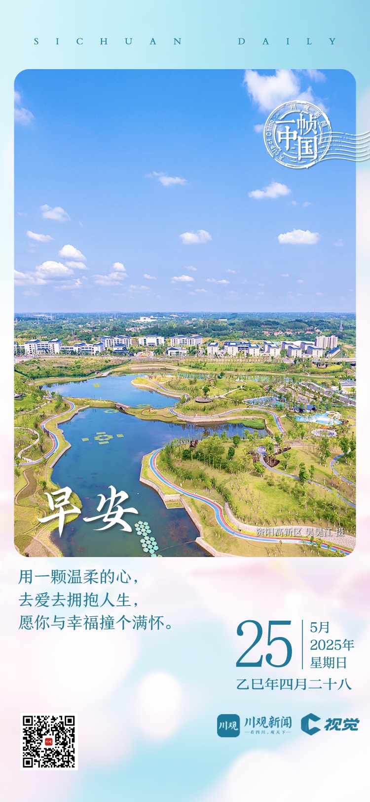今天的《一帧中国》,川观新闻带你来到位于资阳高新区的雁南湖湖滨公园,漫步绿茵湖畔,欣赏蓝天白云与碧绿湖水构成的美丽初夏画卷。