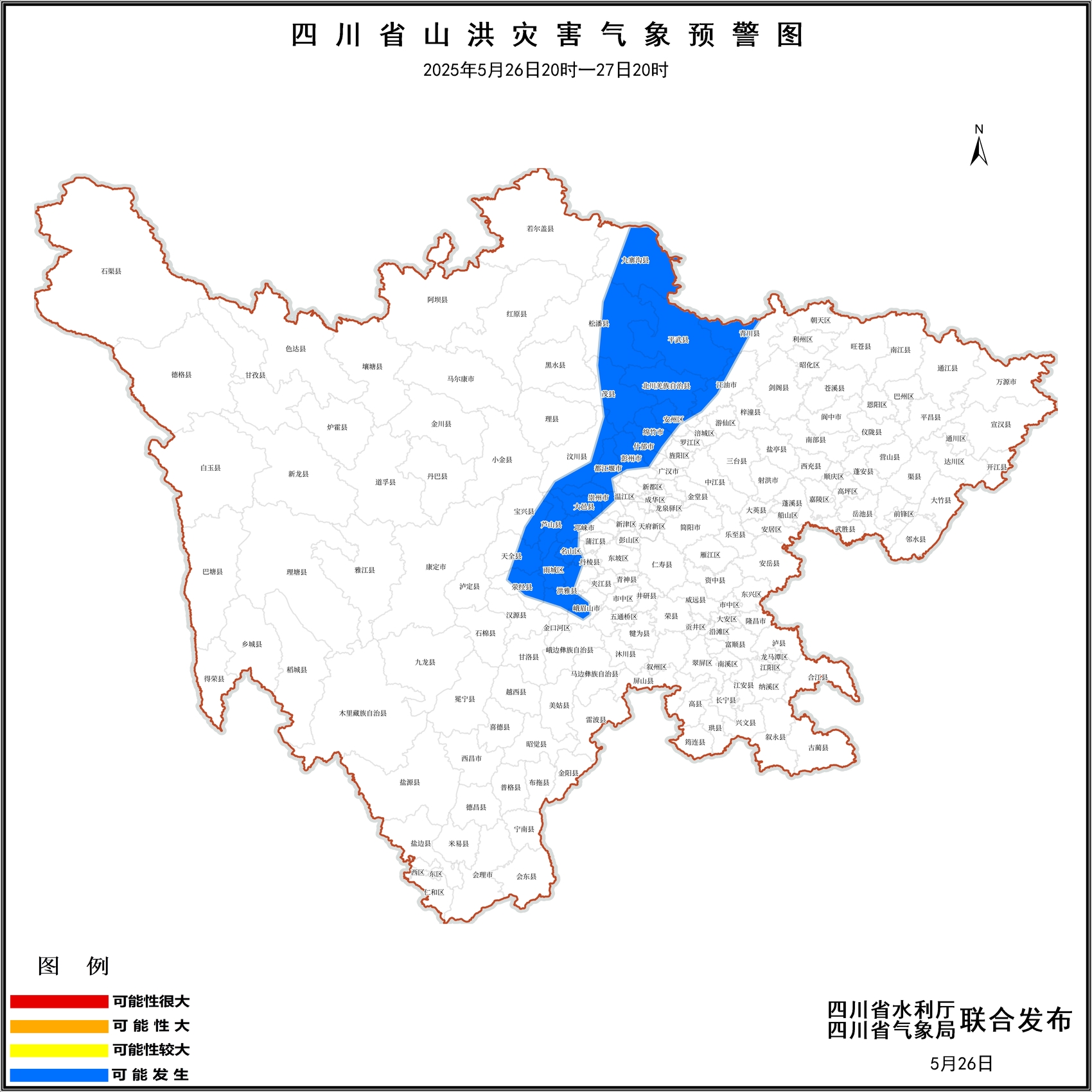 预警信息显示:5月26日20时至27日20时,成都市都江堰、彭州、大邑、邛崃、崇州,德阳市什邡、绵竹,绵阳市安州、北川、平武、江油,广元市青川,乐山市峨眉山,眉山市洪雅、丹棱,雅安市雨城、名山、荥经、天全、芦山、宝兴,阿坝州汶川、茂县、松潘、九寨沟等25个县(市、区)可能发生山洪灾害。