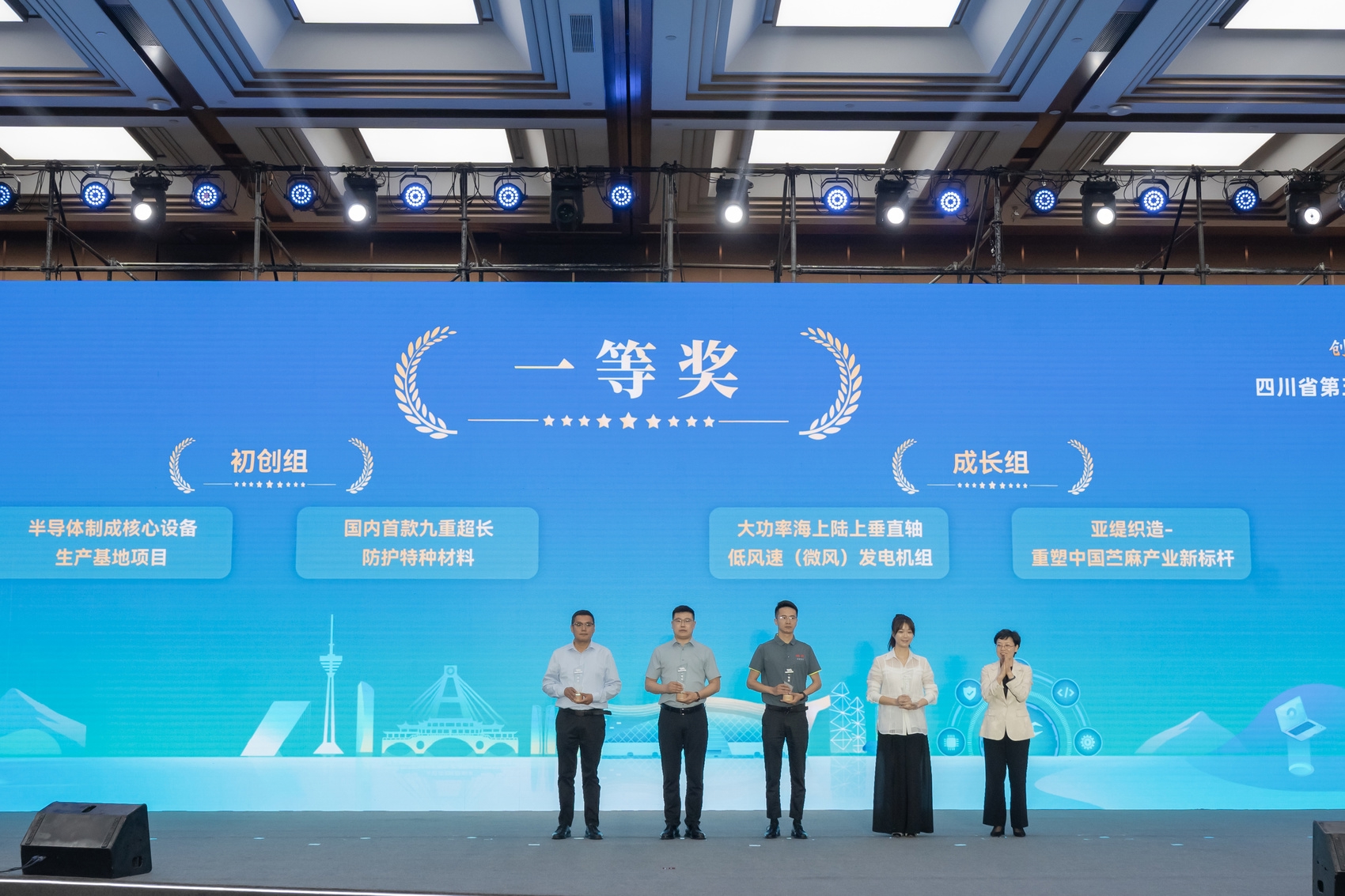 5月26日,在第五届成渝地区双城经济圈就业创业活动周启动仪式上,颁发了第五届“天府杯”创业大赛一二三等奖。本届“天府杯”创业大赛中,“半导体制成核心设备生产基地项目”“国内首款九重超长防护特种材料”荣获初创组一等奖,“大功率海上陆上垂直轴低风速(微风)发电机组”“亚缇织造-重塑中国苎麻产业新标杆”荣获成长组一等奖。