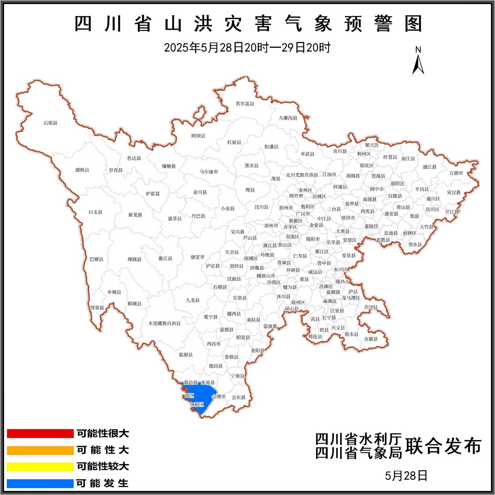 5月28日17时,四川省水利厅、四川省气象局联合发布山洪灾害蓝色预警,攀枝花市东区、西区、仁和、米易、盐边,凉山州会理等6个县(市、区)可能发生山洪灾害。