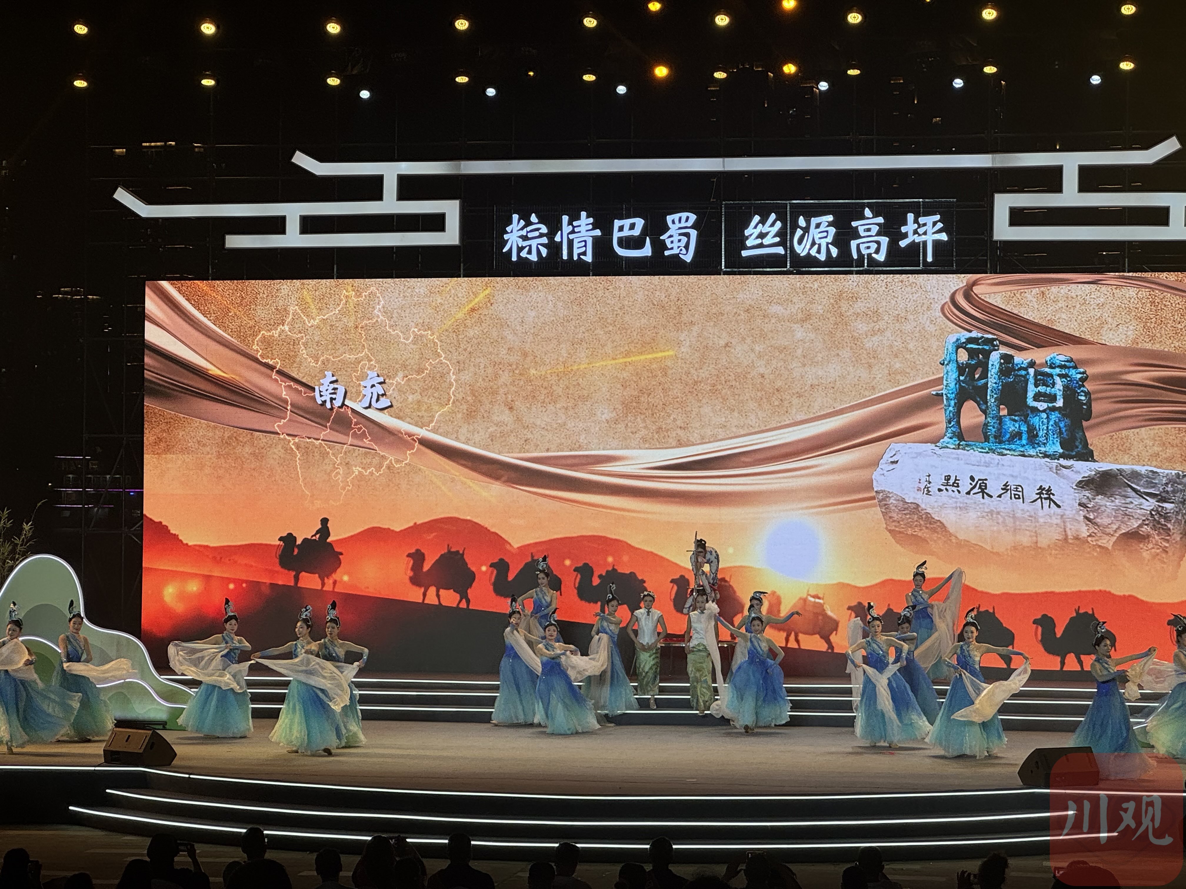 当晚启动仪式上,一场以“粽情巴蜀·丝源高坪”为主题的文艺演出,在嘉陵江畔的金牛广场如期上演。整场演出以南充的“绸都”特色为主线,分为“溯江风·端午源起”“承古今·文脉流放”“越千年·潮涌未来”三个篇章,包括情景表演、歌舞、大木偶戏、川剧、无人机表演等多个节目种类。
