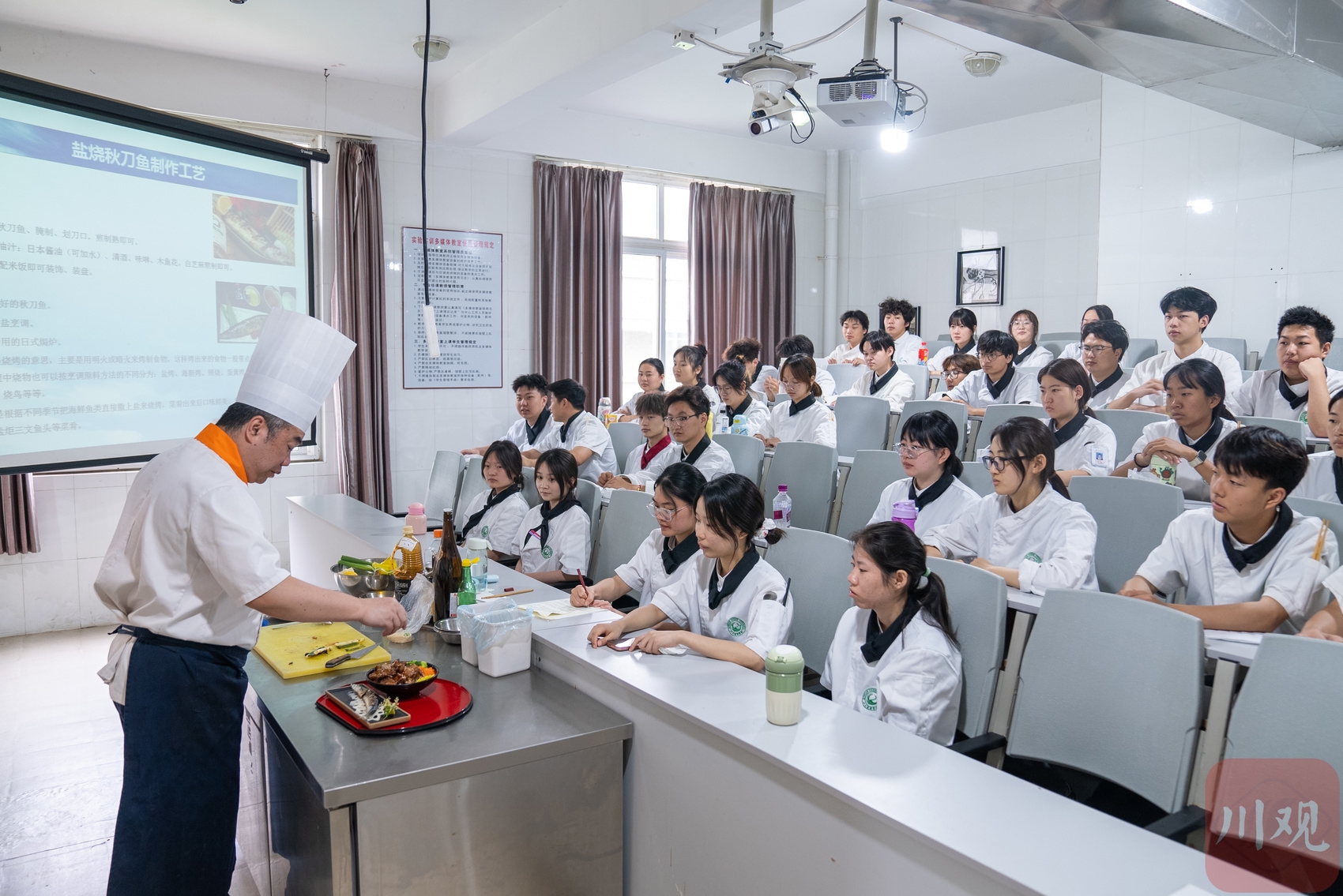“B栋是演示区,C栋是学生实操的教室。”肖悦带着四川在线记者走进B3—17、C2—2两间教室。B3—17正在上日韩料理制作工艺课,教室呈梯字形分布,讲台有一整套烟机灶具,张浩老师正在给同学们演示照烧鸡饭的制作;C2—2是一堂川菜制作工艺(非遗)课,教室几乎与饭店后厨别无二致,两排烟机灶具共有16口大铁锅,同学们4~6人一组,在章迁老师的指导下,练习锅巴肉片、粉蒸牛肉两道菜的制作。这些学生和肖悦一样,他们厨师服的衣袖口袋里也都有一双筷子,炒制完成即可享用自己的作品。