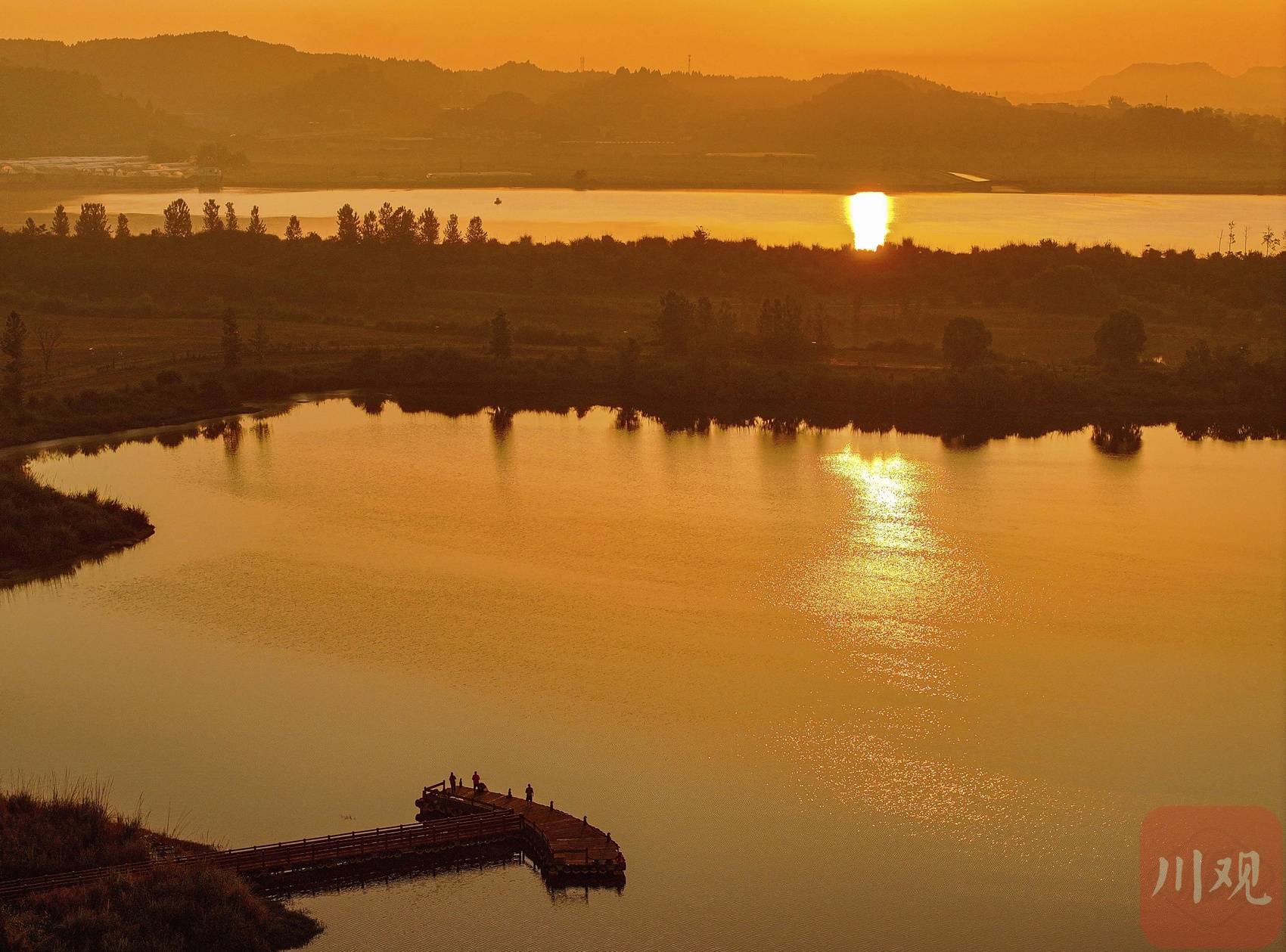 5月29日,一轮红日缓缓从南充市高坪区凤仪湾湿地公园升起,阳光打亮水面。金色的光芒同时铺满大地。