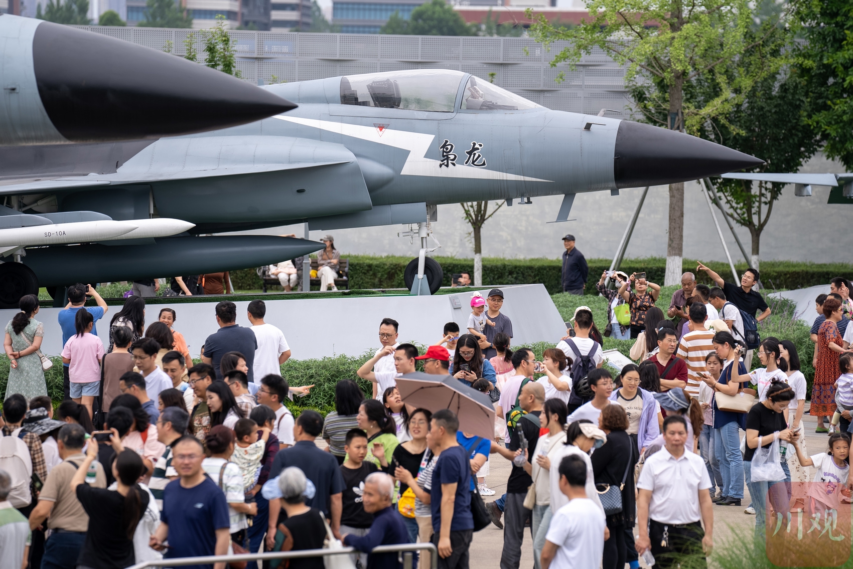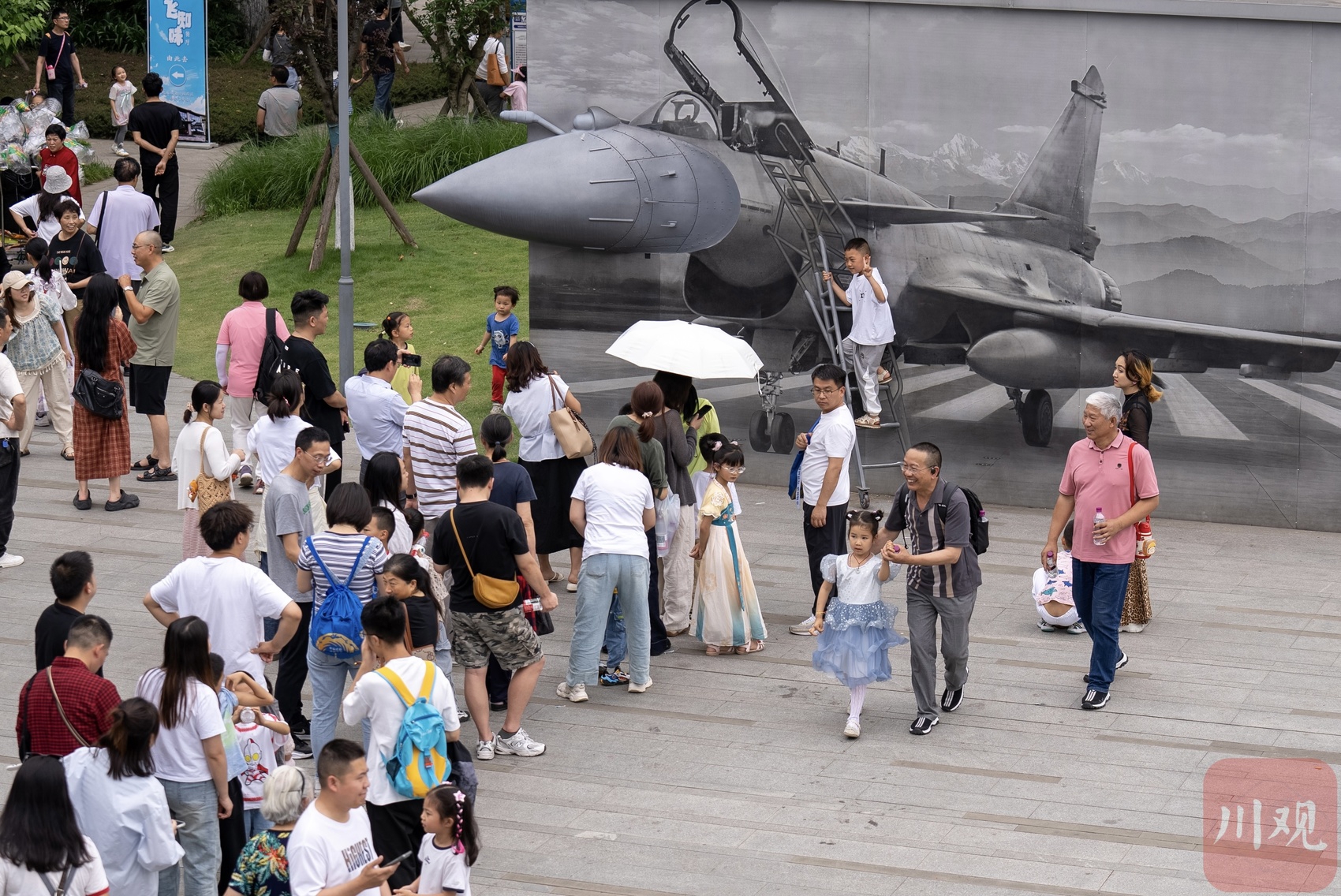 6月1日,成飞公园内,家长和孩子在飞机浮雕前排起长队打卡拍照。