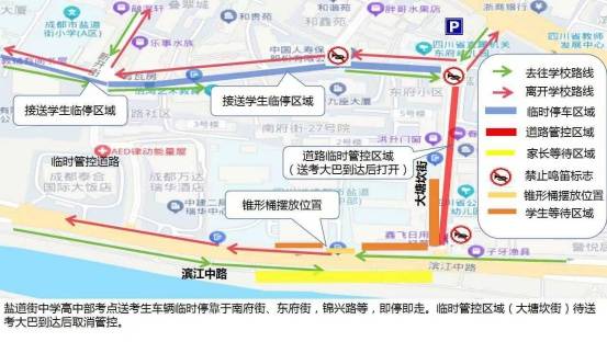 管控区域:盐道街、大塘坎街、滨江中路、锦兴路 、东府街、南府街。盐道街路中央摆放锥形桶,车辆禁止掉头,乱停放,两端摆放禁止鸣笛标志禁止车辆通行、停放,学校大门处设置锥形筒,禁止车辆停放;滨江中路学校门前内侧两端摆放锥形桶,禁止车辆乱停放