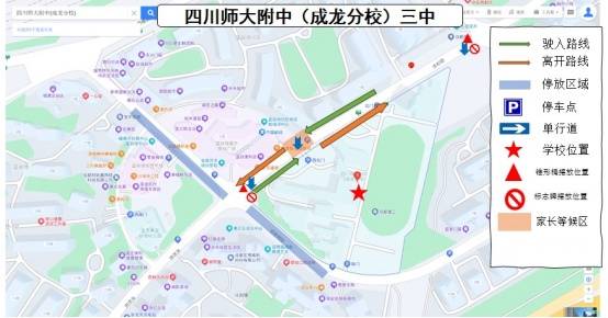 停车指南:送考大巴车在百日红西路学校门前停放,社会车辆临近停放于红豆树街单侧、枫树街单侧