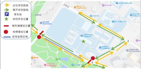 管控区域:百日红西路、月季街。百日红西路树德中学门前路段,两端摆放锥形筒,禁止车辆通行、停放;送考车辆在学校门前对面路边停放;