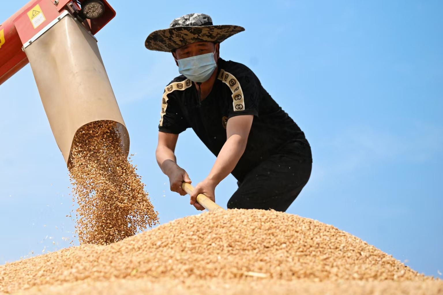 5月19日,中江县永太镇农民对收割的小麦进行装车。新华社发(梁潼 摄)