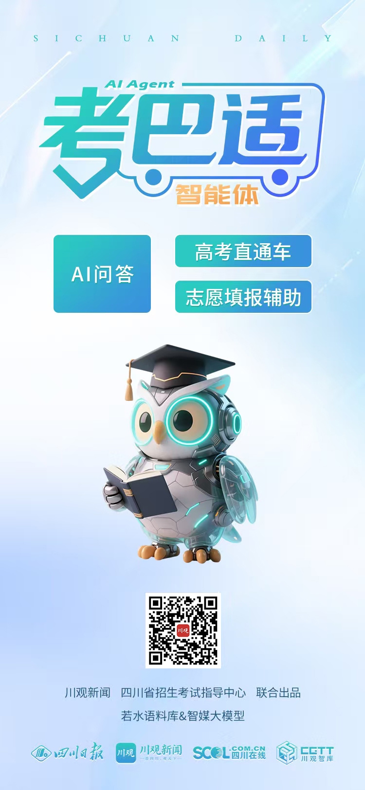 智能体采用智慧猫头鹰IP形象,体现专业亲切陪伴感,用户只需简单提问,“考巴适”即可迅速给出详尽答案,真正实现“问得越深,答得越透”。