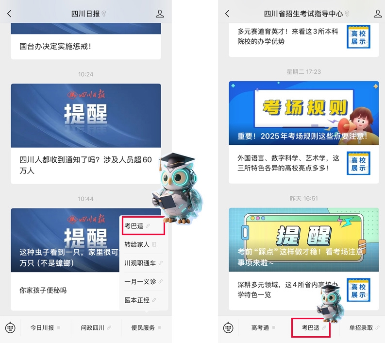 点击“四川省招生考试指导中心”微信公众号底部菜单栏“考巴适”,即可进入。