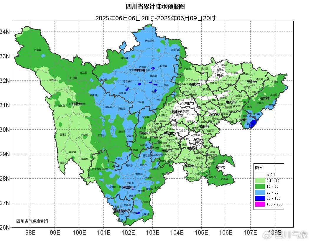6月6日晚上到7日白天:盆地各市多云间阴,东部南部和西部沿山有阵雨或雷雨,局部中到大雨,盆地其余地方有分散雷雨或阵雨;阿坝州、甘孜州大部和凉山州北部多云间阴天有阵雨(雪)或雷雨,其中川西高原北部有中雨,个别大雨,甘孜州西南部和攀西其余地区多云间晴。