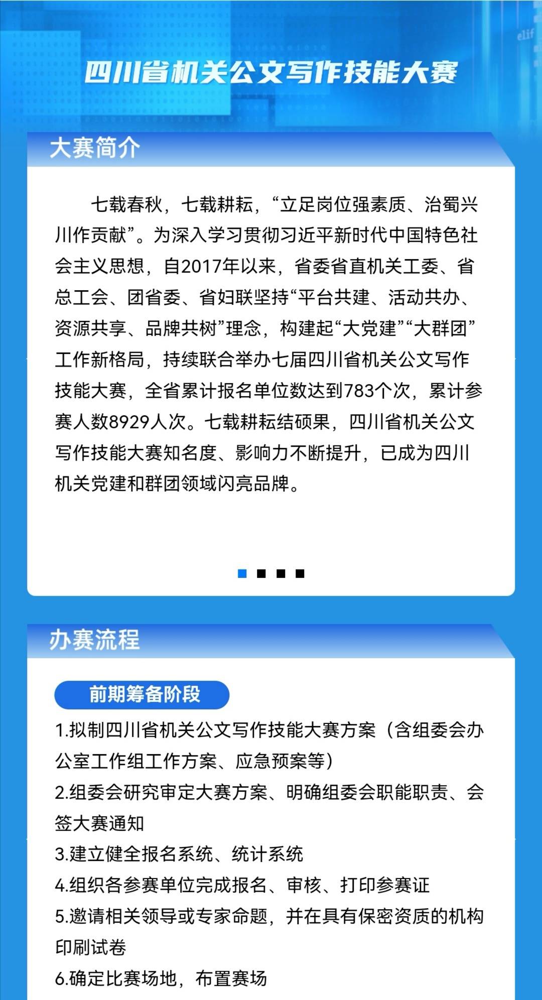 自2017年以来,省委省直机关工委、省总工会、团省委、省妇联坚持“平台共建、活动共办、资源共享、品牌共树”理念,持续联合举办了七届四川省机关公文写作技能大赛,全省累计报名单位数达到783个次,累计参赛人数8929人次。大赛开展以来,共有1830人次获得一二三等奖及综合奖,据不完全统计,获奖者中有超过90%的人员得到了晋升或被选拔到了上级机关任职。