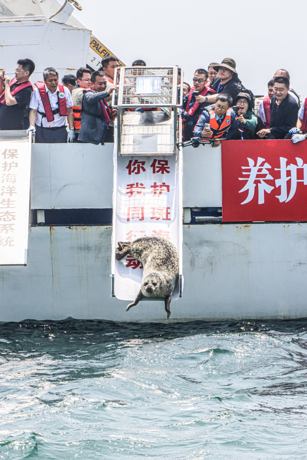 当日,在辽宁大连,5只被救助的西太平洋斑海豹幼崽与4只成年西太平洋斑海豹被放归大海。