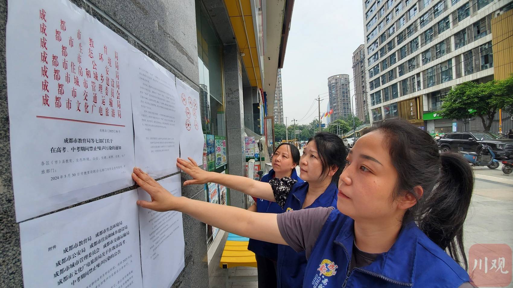 6月6日,2025年高考前一天。上午9点,桂溪街道永安社区工作人员陈雪娇和同事开始在辖区巡查,逐点位检查张贴的《高考、中考期间禁止噪声污染的通知》有无脱落破损。